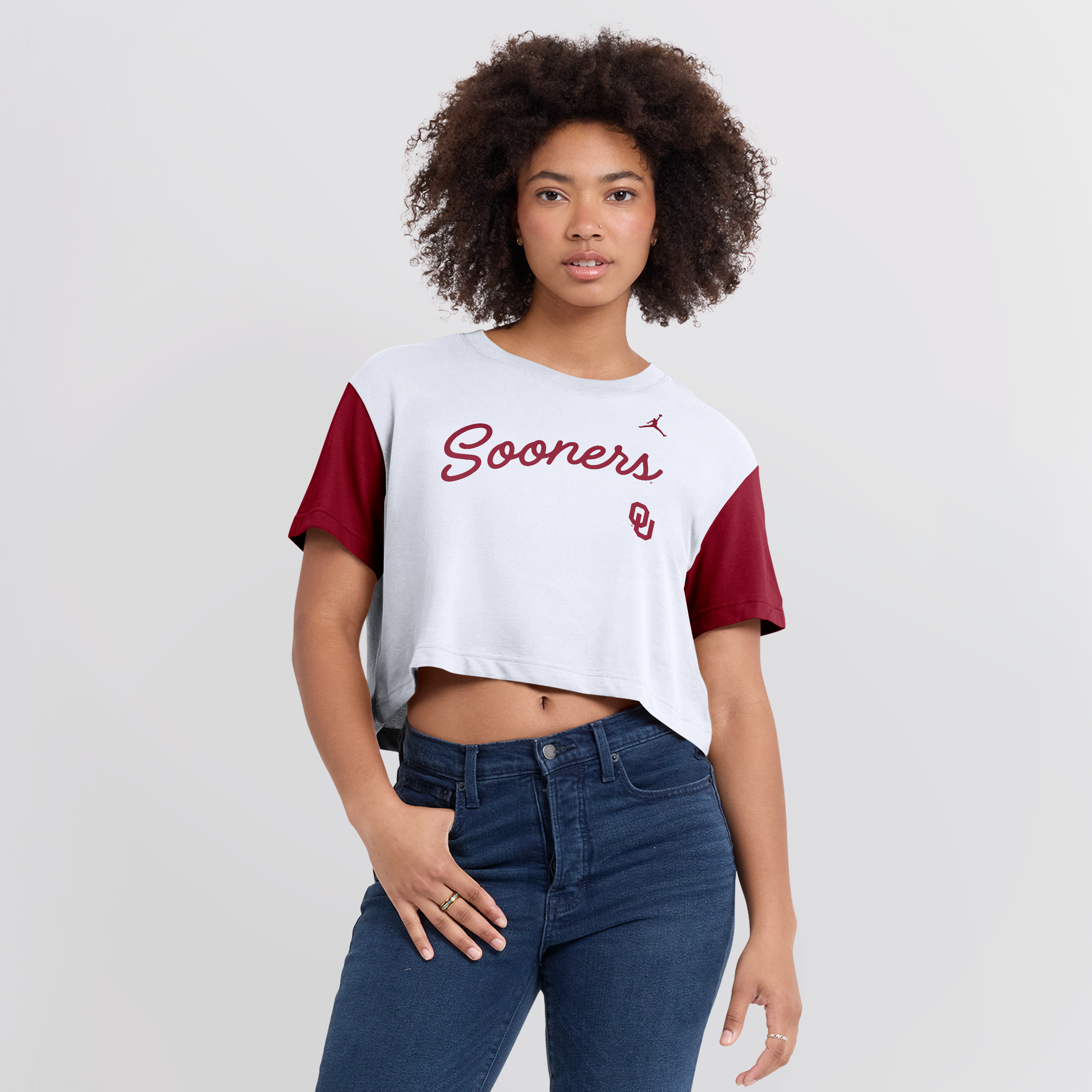 Women’s Jordan Brand White/Crimson Oklahoma Sooners Color-Block Script Dri-FIT Cropped T-Shirt Sign up for ESPN+ now to stream live OU Basketball games!
